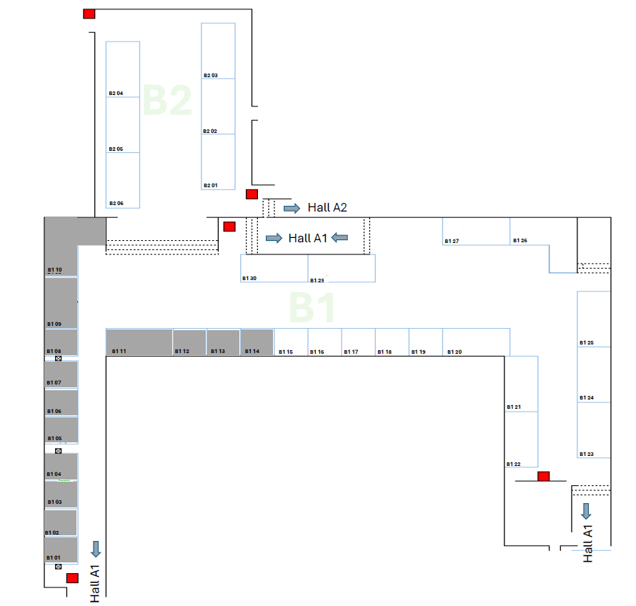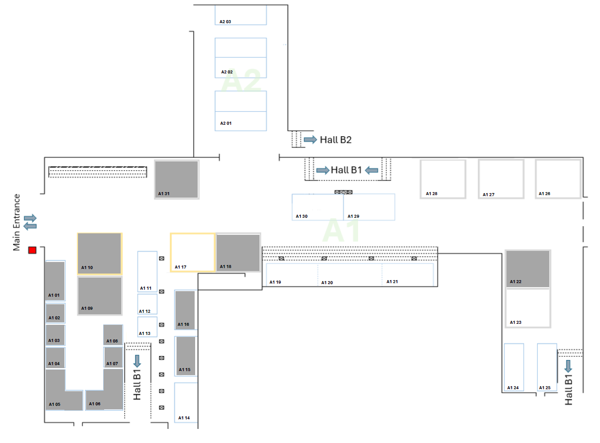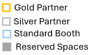 This is an initial floor plan, provided for illustrative purposes only and not drawn to scale. The final layout may vary depending on the spaces booked. Partitions can be removed to create larger areas. Stand allocation is determined by partnership level, booth size, product category, and a first-come, first-served basis.